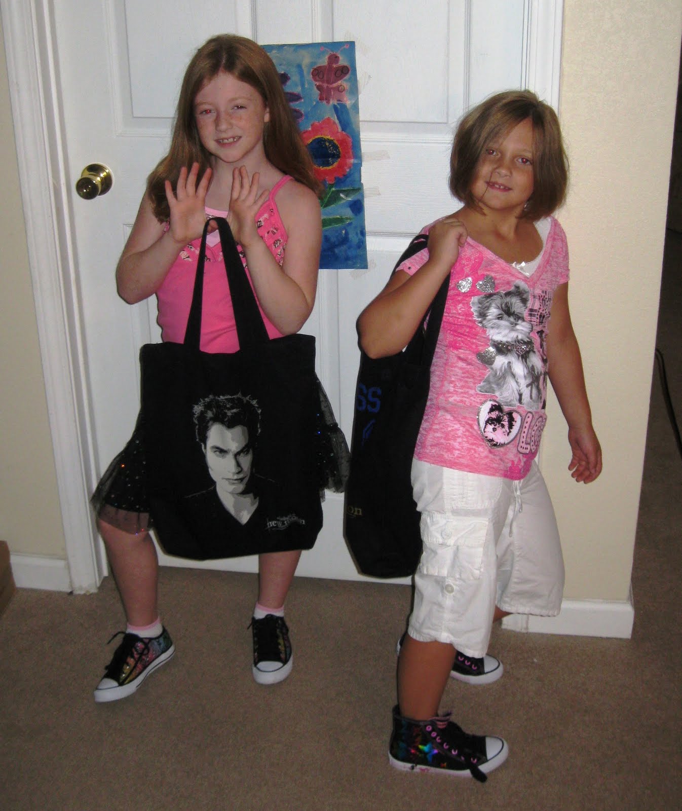 Today is the first day of Kaylen's 2nd grade and Kendall's 1st grade classes. They were both very excited about heading back to school, especially Kendall since this is her first year to go all day. She was most looking forward to having 2 reccess'. Kaylen was looking forward to finding out who all would be in class with her. Here are a few pictures of them showing off their new clothes and backpacks!